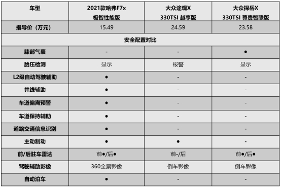安全上,2021款哈弗F7x不仅搭载了L2级自动驾驶功能,同时还拥有并线辅助、车道偏离预警、车道保持辅助、道路交通信息识别、360度全景影像、自动泊车等黑科技配置。反观大众探岳X、途观X,不仅没有搭载 L2级自动驾驶功能,也缺少主流的主动安全配置,不敌2021款哈弗F7x。如360度全景影像功能,能实现360°的视觉无死角,令用户在倒车等情况下,视线更宽阔,避免剐蹭行为,而大众双车仅支持普通的倒车功能,功能不够全面。